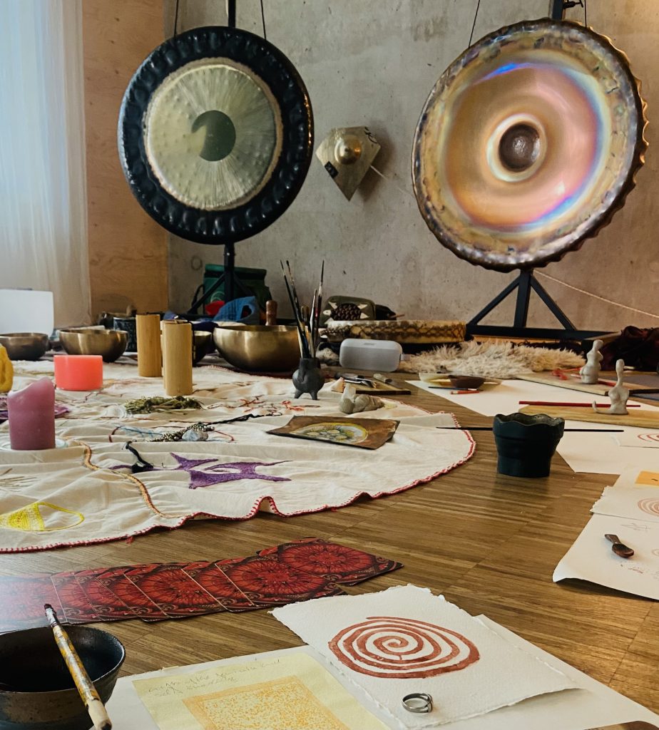 Auf Wunsch male ich ein Bild zu den erlebten Klängen. Ich übersetze deine Frequenzen in die Schwingungen des Gongs und fange sie visuell ein. Über dieses Verstehen auf intuitiver Ebene kann sich ein Begreifen mit allen Sinnen entfalten.
